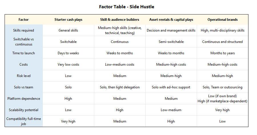 The 2×2 matrix helps you see the big picture, but it doesn’t capture every variable. Even within the same quadrant, two side hustles can feel completely different. That’s where a Factor Table comes in: it’s a checklist of the dimensions you should weigh before committing. Think of it as a “second filter” once you’ve narrowed down your options.
