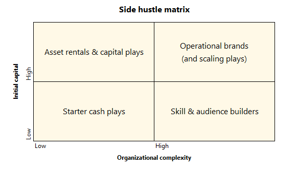 Together these two axes form the side hustle matrix: