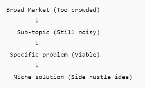 Think of it this way: “fitness” is a broad market and too crowded. Narrowing down to “home workouts” is still noisy. But if you go deeper to the specific problem of “busy parents struggling to exercise at home”, you can create a niche solution like a 15-minute workout app for parents — a side hustle idea with real pull.
