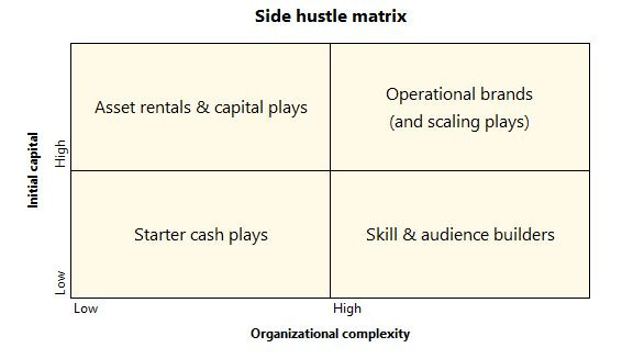 If you’d like the full breakdown of how these quadrants are defined by capital and organizational complexity, you can check our detailed framework article with the side hustle matrix.